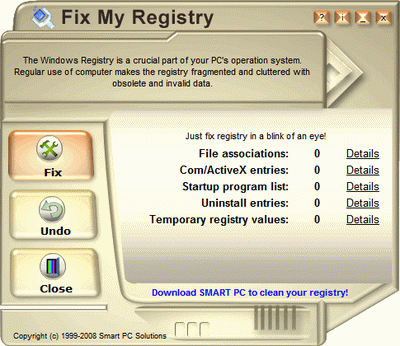 注册表是windows操作系统的重要组成部分,电脑长时间使用,经常安装卸载软件会使注册表变的零散和杂乱并且有大量陈旧的和无效的数据,fix my registry可以帮助您修复和清理注册表,使系统保持稳定和清洁,您要做的只是点击一下鼠标,一切就可以在瞬间完成
