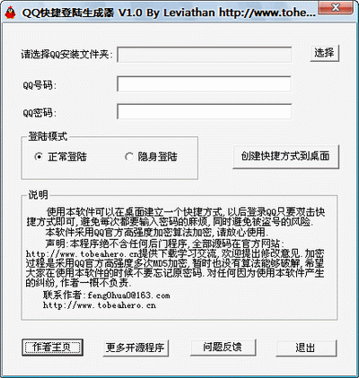 使用本软件可以在电脑桌面创建一个qq的快捷登陆方式,以后登陆qq,只需要双击运行这个快捷方式,避免了输入qq号和密码的麻烦,同时也从根本上防止了qq被盗(因为qq盗号一般采用键盘记录,这里避免了输入密码,所以可以绝对避免盗号).本软件采用腾讯官方提供的高强度多次md5加密法,只能正向加密,不能进行反向解密,所以请放心使用. 1.1版本更新说明:支持10位qq