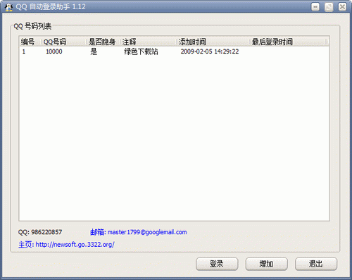 绿色软件,本软件支持qq自动登录,你只要在软件里面设置好qq的用户和密码,以后每次登录qq就不用再重复输入了,只要简单地双击便可以登录。本软件支持多帐号,可以多个人同时使用互不影响,每个人可根据自己的用户和密码登录维护自己的qq帐号。软件还支持用不同目录的qq来启动,每个qq的帐户可以设置一个qq的执行程序,灵活方便