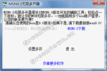 msn9.0无限多开器是针对windows live messenger msn9.0版本开发的辅助工具,鼠标轻轻一下,就让你的msn无限多开,一台电脑用多个msn账户登录,让你的联系更方便!这是绿色版本,无需安装,解压即可使用!使用前请确认您使用的是msn9.0版