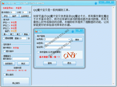 qq魔卡宝贝是一款纯辅助工具。 玩家可通过qq魔卡宝贝快速登录qq魔法卡片,所有操作需在魔法卡片页面中进行,绝对没有破坏游戏数据或更改游戏数据,所有无需担心封号或降级的问题,本辅助软件提供了提醒器的功能,让玩家能更好的体验游戏带来的乐趣