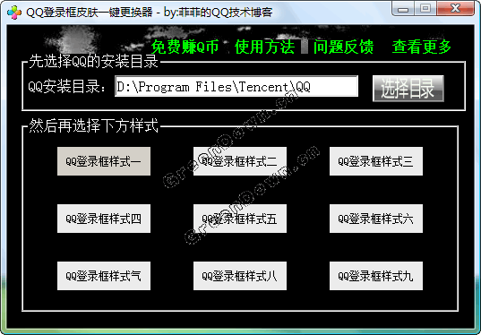 使用该工具可以轻松实现一键更换qq登录框皮肤的目的,目前供有9中皮肤可以任你免费换,绿色工具无需安装,下载解压即可使用。没有任何插件,完全免费使用!