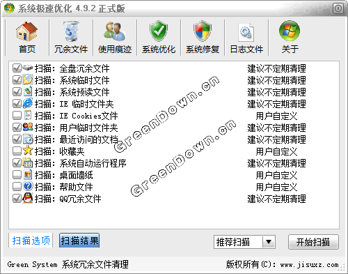 系统极速优化主要用于删除系统冗余文件、清理用户使用痕迹、注册表优化,注册表修复等等,本软件特色功能在于,可以修复互联网上常见系统问题,就算用户的系统被恶意修改注册表,或中了常见的病毒,而被禁用系统里的某些功能,本软件都能帮用户修复好