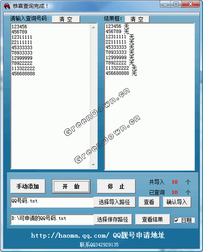 随着qq用户越来越多,qq靓号也成为很多人关注,有人不需花大价钱就为淘到一靓号,都想拥有一个自己qq靓号。本软件由下载咯软件站提供可快速批量查询qq靓号,手动添加查询,批量查询qq靓号,可快速检测出已注册和可注册qq靓号,让您赚钱,淘号两不耽误。软件如有任何问题可到官方www.xiazailo.com提出,手动添加想查询的号码查询即可批量添加只需把要批量查询的号码直接用txt文本保存起来,导入添加即可完成!方便简单快速。