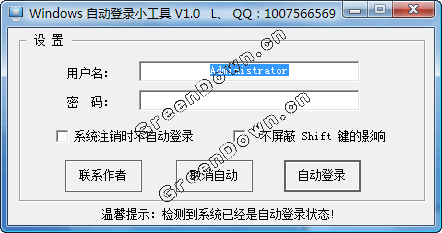 支持 xp/2003/ 系统 自动登录,win9x/2000/vista/win7 没有测试过~提供附加自动登录注销有效和屏蔽shft键功能