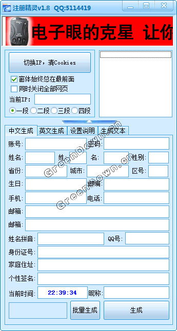 注册精灵是一款换ip 清c以及资料生成等软件,支持win7,换多段ip,生成各种资料,及英文资料,批量生成,身份证号,住址等。注册手的好伴侣。