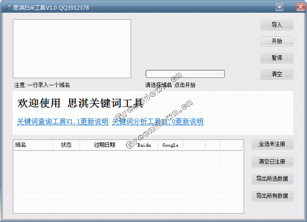 思淇域名批量查询工具是采用c#(3.5)根据站长需求开发的一个站长助手,主要功能:根据某一域名查询其是否注册,以及百度和google的收录量.来衡量一个域名的价值