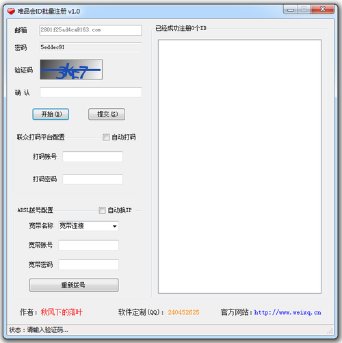 本软件主要用于批量注册唯品会账号,高效、方便、快捷。使用方法:启动本程序后,点击【开始】按钮,软件自动随机生成用户名和密码信息。配置好打码平台的账号密码和宽带的账号密码,即可实现全自动打码注册和自己更换ip功能。注册成功的id将实时保存到程序目录下的【注册成功的id.txt】文件里。格式为:id-密码。注意:如果软件无法打开,请先安装microsoft .net framework 4.0