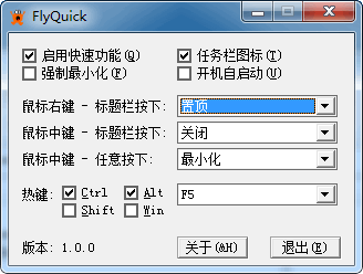 flyquick是一个绿色快捷鼠标软件,能够使用鼠标右键或中键快速关闭窗口、最小化窗口和置顶窗口,可设置开机自启动,可自定义热键。和pitaschio相似,不过有人反映pita对64位win7支持得不是很好,所以diy了一个。