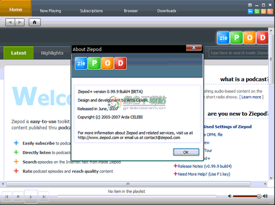 ziepod 是一款 podcast 接收器和播放器软件,允许你组织你所喜爱的 podcast,监视它们的变化,下载最新的片断以及导出到你的 mp3 播放器当中.该软件集成了一个让你可以寻找新的 podcast 并且将其添加到你的节目表当中的 podcast 搜索功能. ziepod 提供了一个带有不同布局风格的现代化界面并且集成了让你可以收听你的 podcast 的播放功能.额外的功能包括 ipod/itunes 支持, bittorrent 支持,用户等级, opml 导入,自动化同步,在更新时弹出通知等功能