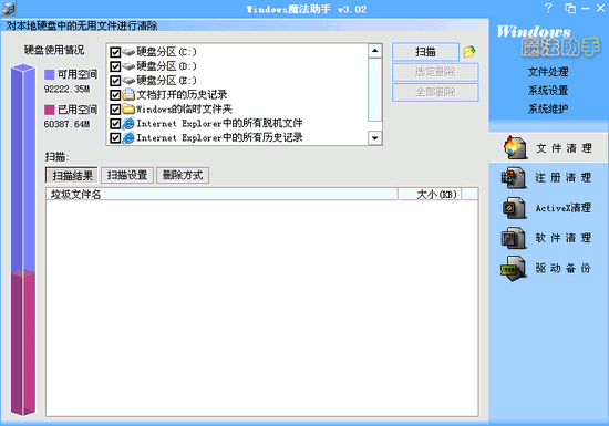 windows魔法助手主要功能有文件日常清理、注册日常清理、其它日常清理、启动项目清理、软件卸载清理、磁盘文件清理、注册信息清理、文件信息设置、文件资料粉碎等。魔法助手 ver 3.13 build 9.906 最新变化 1、文件信息设置 (1)、增加了时间模拟的条件2、调整了消息提示,使主次更加清晰3、调整了目录选择对话框,在选择目录的同时可以新建文件夹