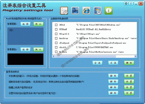 注册表综合设置工具是一款专门设置注册表的工具,将常用的注册表信息整合到一起,简化操作过程,包含开机启动、桌面样式、ie样式、系统设置、系统信息等