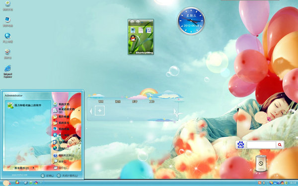 这款主题的桌面背景是一个小女孩拿个一把气球,趴在木马上面甜美的睡着觉,天边的云和海水都变成柔和的蓝色催她入眠了,她现在肯定在做着甜美的梦吧~